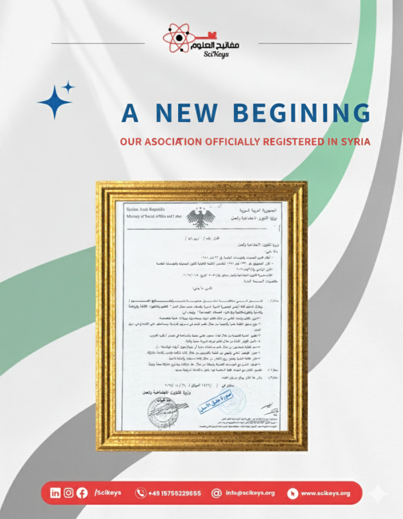 L’ Association SCIENCES KEYS a le plaisir d’annoncer qu’elle a officiellement reçu son accréditation et sa licence finale du Ministère des Affaires Sociales et du Travail de la République Arabe Syrienne, conformément à la décision n° /5157/ publiée le 16 novembre 2025.